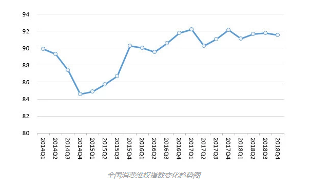 八是全国消费维权指数保持高位。2018年,全国消费维权指数平均为91.53,较去年同期增长了0.11个点,与五年平均值相比,增长了1.9个点。