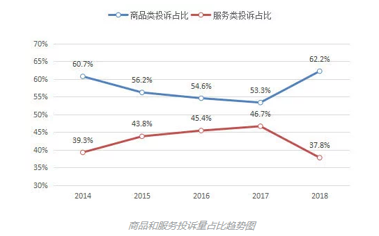 一是商品投诉比重扩大。2018年,全国市场监管部门共受理商品投诉231.81万件,占比62.2%,同比增长61.3%,服务投诉140.75万件,占比37.8%,同比增长12.1%。