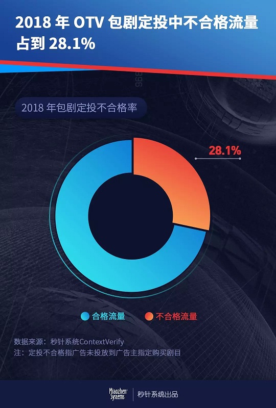 尽管OTV包剧定投流量不断增长,但投放流量质量却不尽人意。基于秒针系统2018年全年OTV包剧活动的监测数据,包剧定投中不合格流量达28.1%,即有28.1%的流量未投放到广告主指定购买的剧目,给广告主带来巨大损失。
