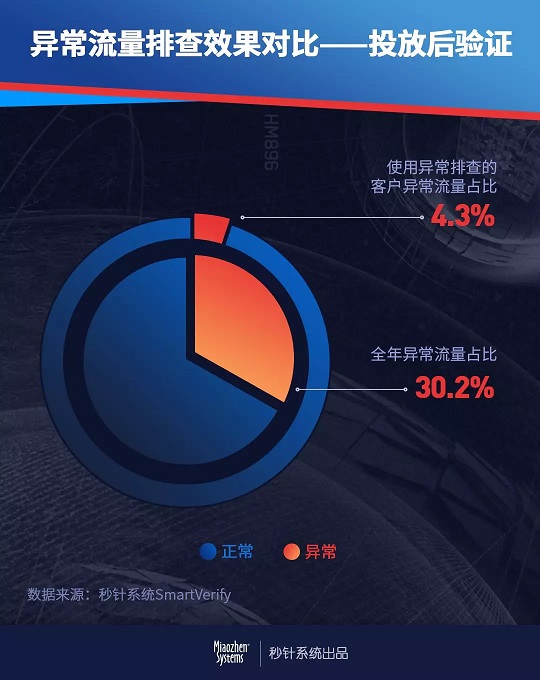 秒针系统,作为行业第三方代表,始终走在打击异常流量的最前沿,致力于以全面有效的解决方案保护广告主流量安全。在使用秒针系统异常流量排查工具SmartVerify后,客户投放后验证,异常流量平均占比仅为4.3%,远低于全年整体的30.2%;