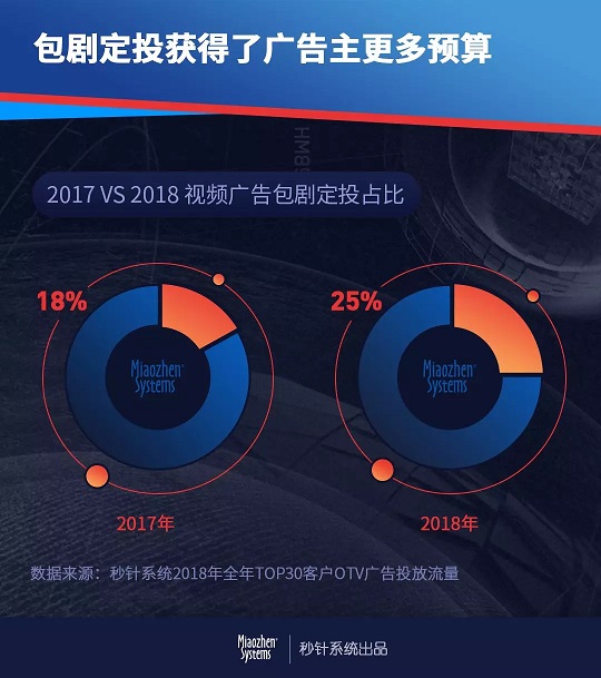 随着IP的兴起和商业化探索的深化,包剧定投成为互联网广告投放的热门方式。以秒针系统Top30客户为例,包剧定投流量在2018年全年OTV广告投放流量中的占比达到了25%,与2017年的18%相比,增长了7个百分点,包剧定投获得了广告主更多的预算。