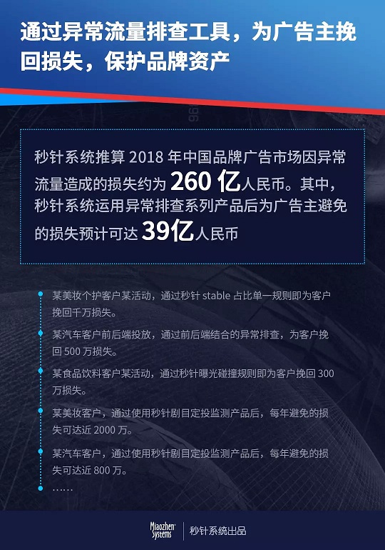 其中,秒针系统,多年来持续为广告主提供系统化的品牌广告效果测量与追踪服务,2018年运用异常排查系列产品后为广告主避免的损失预计可达39亿人民币,并将持续加大在反异常流量技术手段和策略上的研发资源投入,积极推动数字广告生态的健康有序发展。