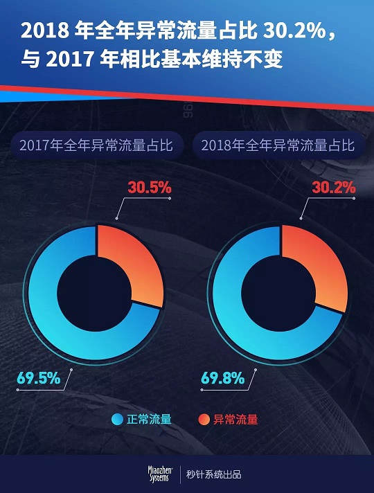 异常流量全年占比30.2% 形势仍较为严峻2018年全年异常流量的占比为30.2%,与2017年的30.5%相比,整体占比有略微下降,但基本维持不变,异常流量问题形势仍较为严峻。