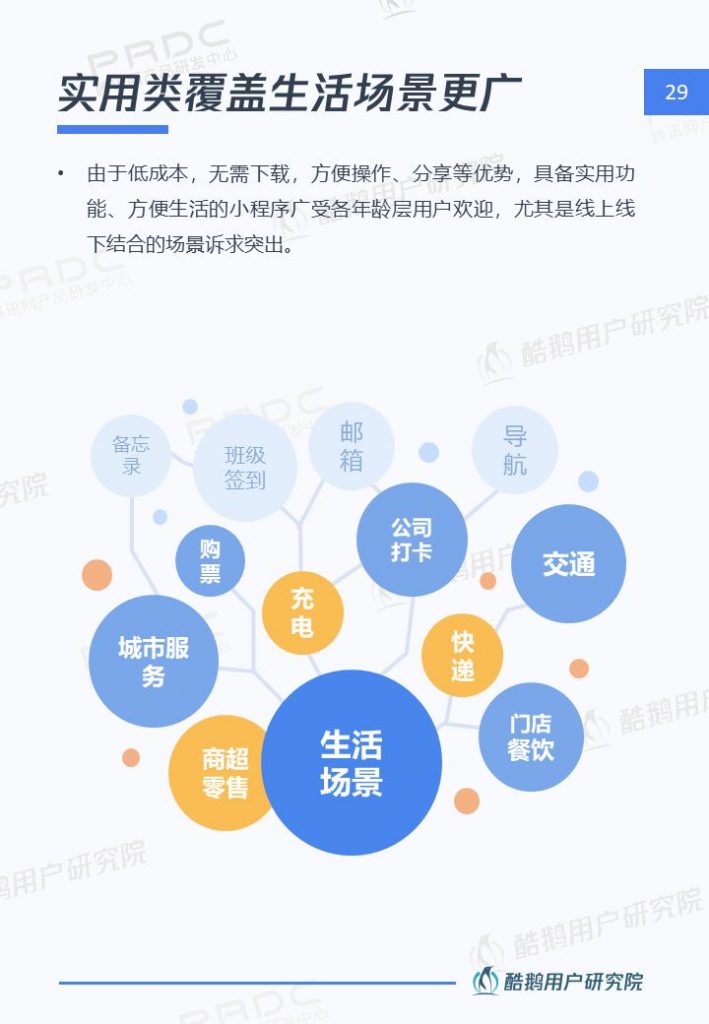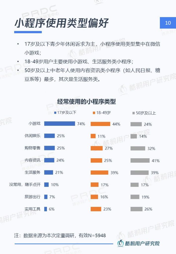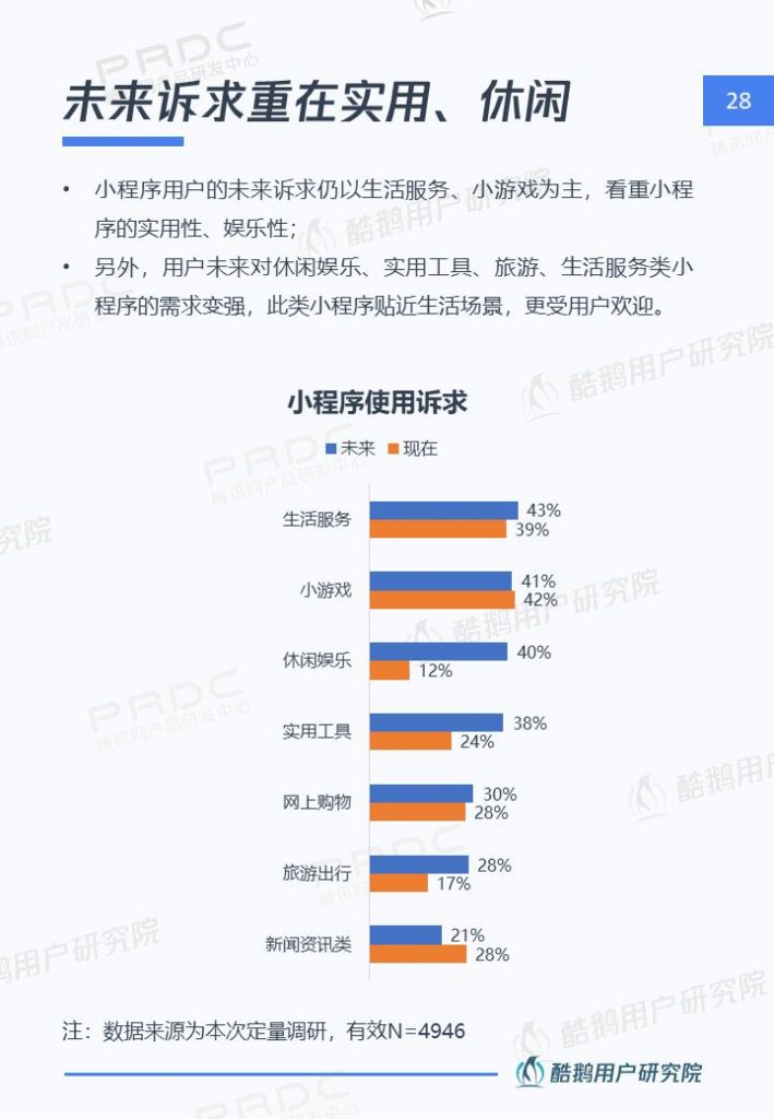 近7成用户看好小程序,超4成用户认为小程序可以替代不常用APP;年轻用户喜爱创意休闲,年长用户看重生活实用;未来线下、生活类场景仍是小程序的重要战场。