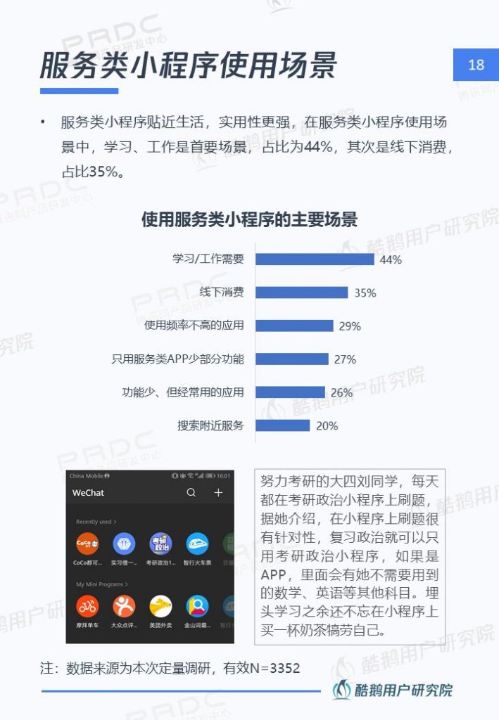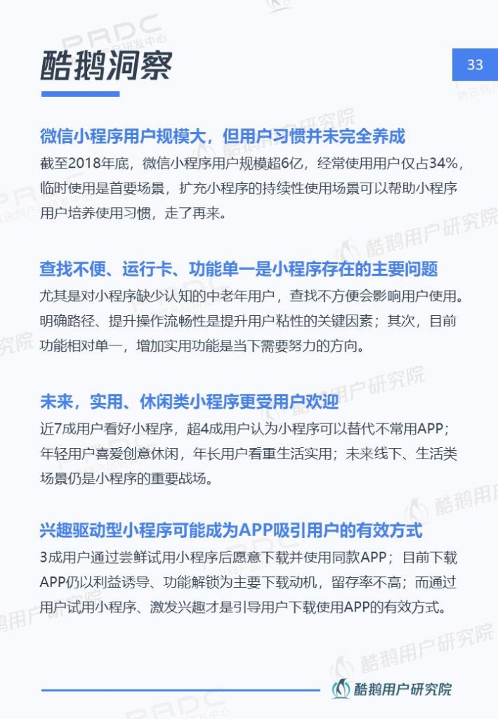 截至2018年底,微信小程序用户规模超6亿,经常使用用户仅占34%,临时使用是首要场景,扩充小程序的持续性使用场景可以帮助小程序用户培养使用习惯,走了再来。