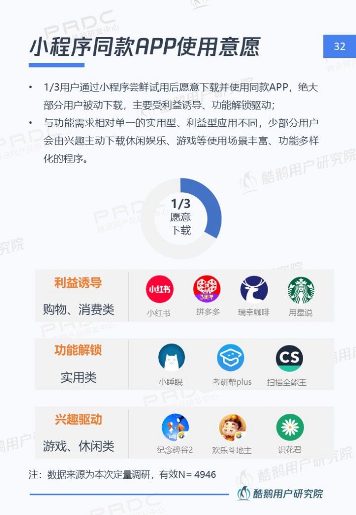 3成用户通过尝鲜试用小程序后愿意下载并使用同款APP;目前下载APP仍以利益诱导、功能解锁为主要下载动机,留存率不高;而通过用户试用小程序、激发兴趣才是引导用户下载使用APP的有效方式。