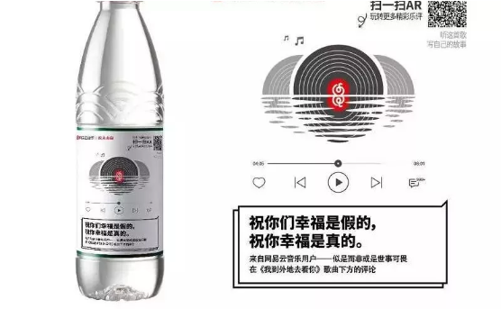 于是,网易云音乐就和农夫山泉合作了,这时候,农夫山泉的产品就变成了一个媒体,消费者每喝完一瓶农夫山泉至少需要一分钟,也就意味着在这一分钟之内,农夫山泉瓶身上的网易云音乐至少会占据消费者的注意力,而无数瓶农夫山泉就构成了一个颇具规模的媒体群。