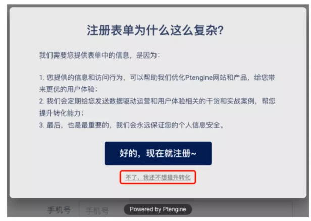 - 你要是还不想注册,那就点击下面那个按钮“不了,我还不想提升转化”,看到这个,你是不是就得三思一下,“我难道真的不想提升转化么?”;流量红利消失的时代,获客成本这么高的时代,老板给你减预算又加KPI的时代,你…就真的不想提升转化嘛?嗯??