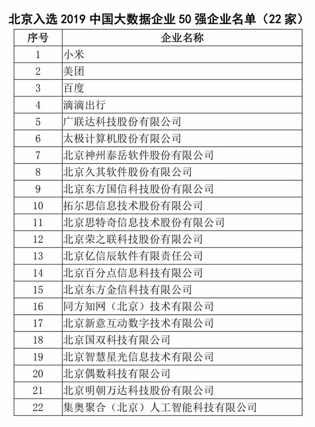 9月18日 北京22家软件企业入选2019中国大数据企业50强