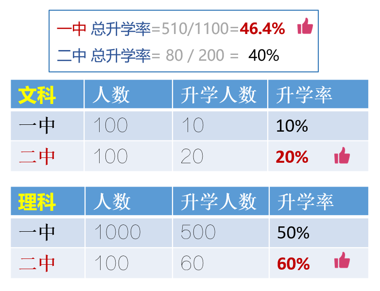 回到开头的升学率的例子,一中在文科理科升学率都低于二中的情况下,总升学率却高于二中,很多人不理解,这其实是统计学上一个经典的悖论——辛普森悖论,它是英国统计学家E.H.辛普森于1951年提出的一个经典统计学现象,即总体结论和部分结论恰好相反。