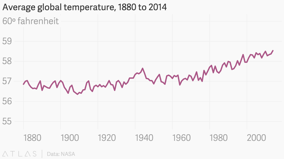 2.刻意伸缩的Y轴刻意拉长缩短,为的是突出或者缩小数据变化,我们来看一个典型的案例,一些反对气候变化的人士绘制了一张一百年来全球平均温度的图——