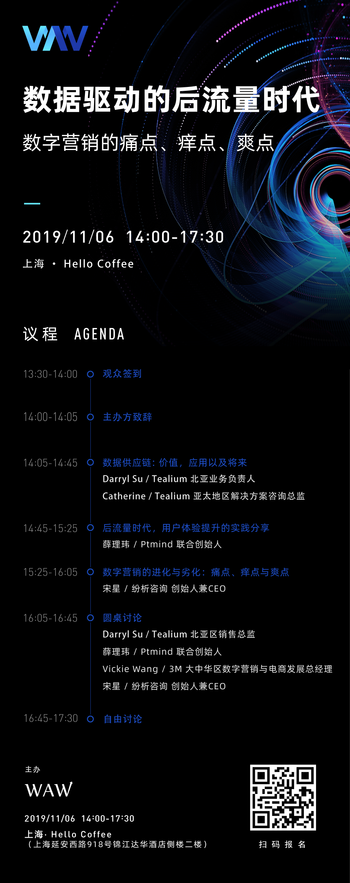 随着流量获取变得不易,过去粗狂式运营已经成为过去式,随之而来的便是精细化运营,“后流量”时代悄然而至,在后流量时代,数字营销、用户体验、数据应用会发生怎样的变化,而我们又该如何应对?11月6日,我们邀请Tealium(一家在美国非常有名的数据公司)、Ptmind(一家在日本和中国都做得风生水起的数据公司)、3M(我们都用过他们家的各种牛逼产品)共同参与一次新的WAW沙龙。本期沙龙的主题是《数据驱动的后流量时代:数字营销的痛点、痒点、爽点》。期待向大家展现全球前沿的数据应用方法和数据应用的落地案例,现场拆解数据“黑箱”,一起听一场营销体验优化和数据应用进化的交响乐!