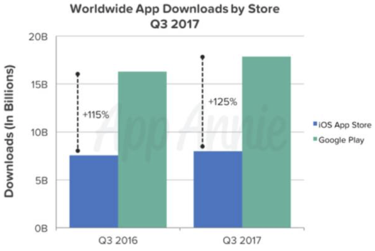 苹果App Store和谷歌Google 两大主要应用商店第三季度全球下载量接近260亿次,较去年同期增长8%。这一数字并不包含应用重装和升级数据,只包含新下载数据。换句话说,这可以描绘出应用经济的真实增长,而没有包含人们因为要获得现有应用的新版本,或者重新下载之前安装过的应用而进行的下载行为。