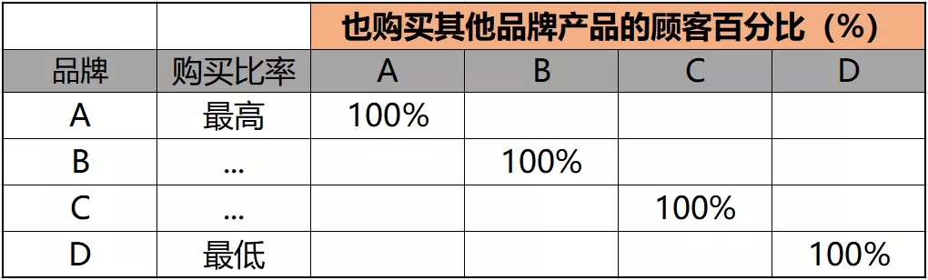 如下表格是一个没有数据的购买重合表格,它可以展示出,同一种类产品中,一个特定时间内,品牌和竞争对手顾客重合的程度。单元格中的100%是指品牌和自身的顾客重合,从逻辑上来说,应该就是100%的。