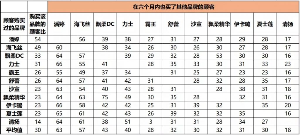 在HBG(中文名:非传统营销)一书当中,提供了一个方法“顾客重合度”分析方法——采用的是购买重合度表格,调研的是一段时间内,购买A品牌的顾客,同时也购买B品牌至少一次,就被算作是重合。