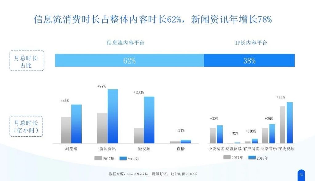 根据QuestMobile和腾讯灯塔在2018年的统计数据,信息流消费时长占整体内容时长62%,其中新闻资讯、短视频类信息流消费时长在去年得到了大幅增长。