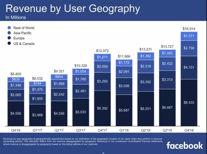 在地区收入上,Facebook采用的是统计方法是根据用户行为发生所在地进行统计,继而可以将用户增长与收入增长挂钩。根据这种算法,2018年美国及加拿大地区收入为270亿美元,欧洲地区收入为138亿美元,亚洲地区为95亿美元,其他地区为54亿美元。