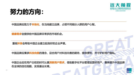 报告共分为五部分,分别对“分化、健康、环保、科技向善”四个关键词进行了充分的调研数据分析研究。同时,益普索中国董事长刘立丰还针对中国品牌出海提出了五个建议(如图所示):